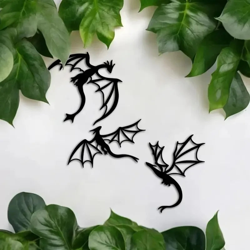 Let your walls come alive with the spirit of flight and flame. This set of three soaring dragon silhouettes, crafted from durable iron, captures the grace and power of these mythical guardians in motion. Perfect for fantasy lovers, this wall art transforms any home, office, or outdoor space into a realm of imagination.