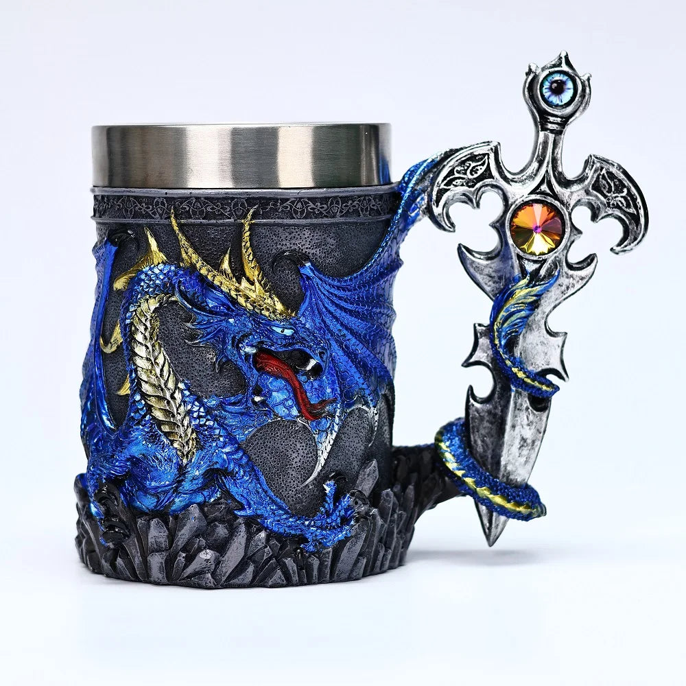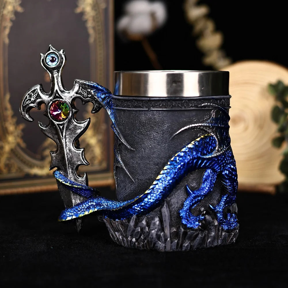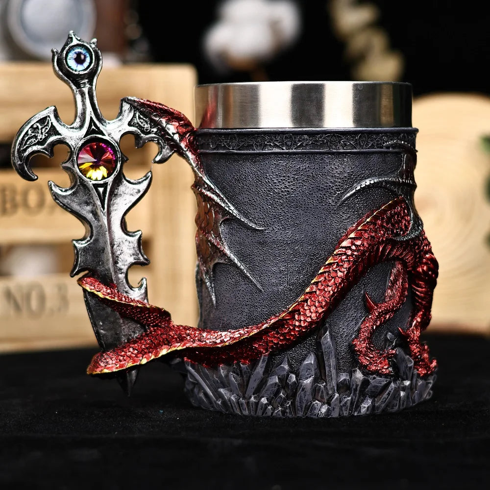 A mighty dragon coils across the mug’s surface while a jeweled sword forms its commanding handle — a tribute to epic battles and ancient tales. The stainless steel interior keeps your drink pure and cool, making it perfect for any beverage worthy of a warrior’s toast. A bold centerpiece for any fantasy collection.